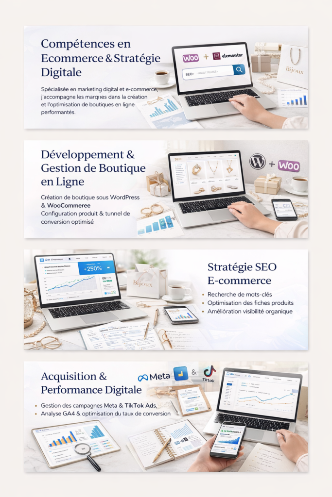 Spécialisée en marketing digital et e-commerce, j’accompagne les marques et entrepreneurs dans la création, l’optimisation et la croissance de boutiques en ligne performantes.